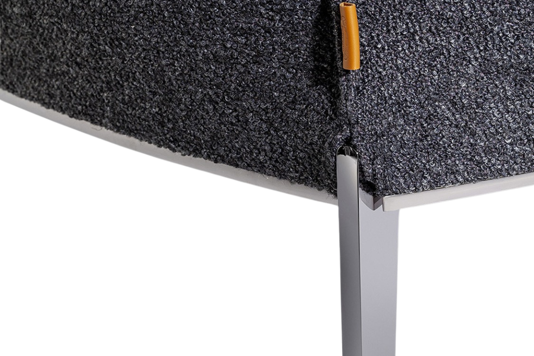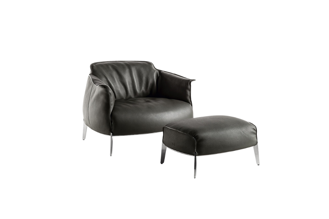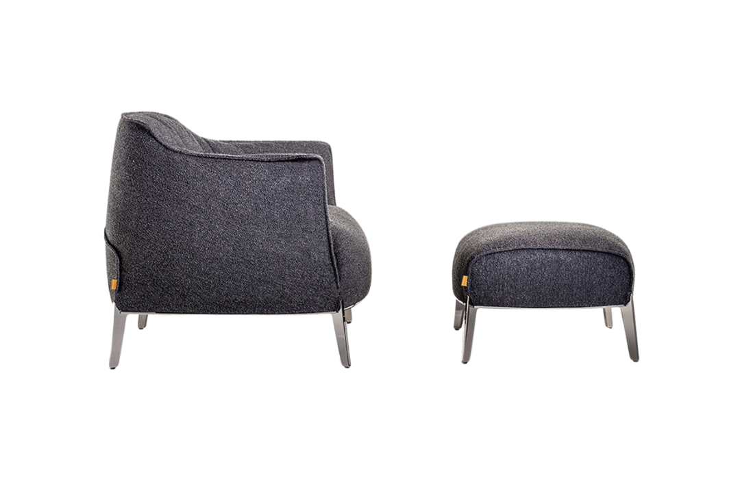 The Archibald Gran Comfort armchair combines refined craftsmanship with exceptional support. Its base features four steel feet linked by an outer frame in a rich ruthenium finish, while the seat is crafted from beech and the backrest from steel with elastic belt support and a flexible upper section for added comfort. Scratch-resistant black paint enhances durability. The seating system uses elastic belts and two ergonomically shaped polyurethane cushions, each wrapped in a plush goose-down quilt and secured with Velcro for a perfectly tailored fit. The result is a luxurious, enveloping armchair designed for deep, lasting comfort.
