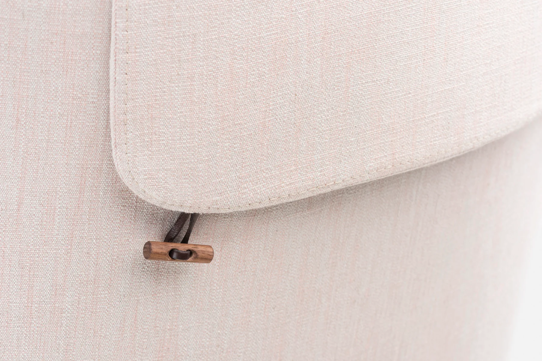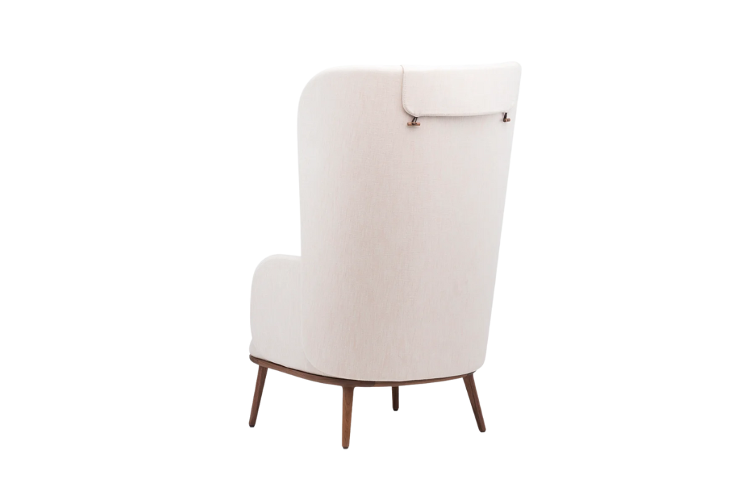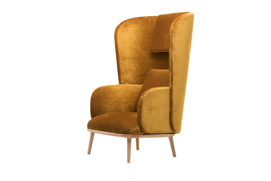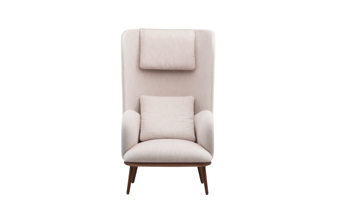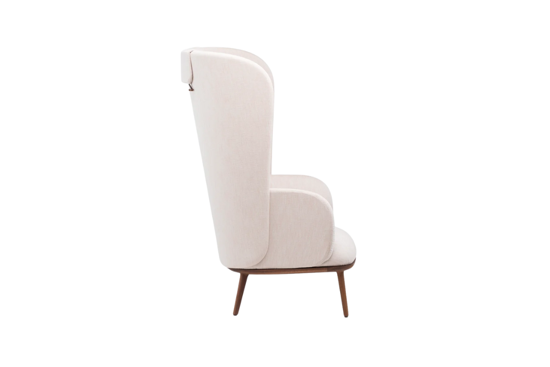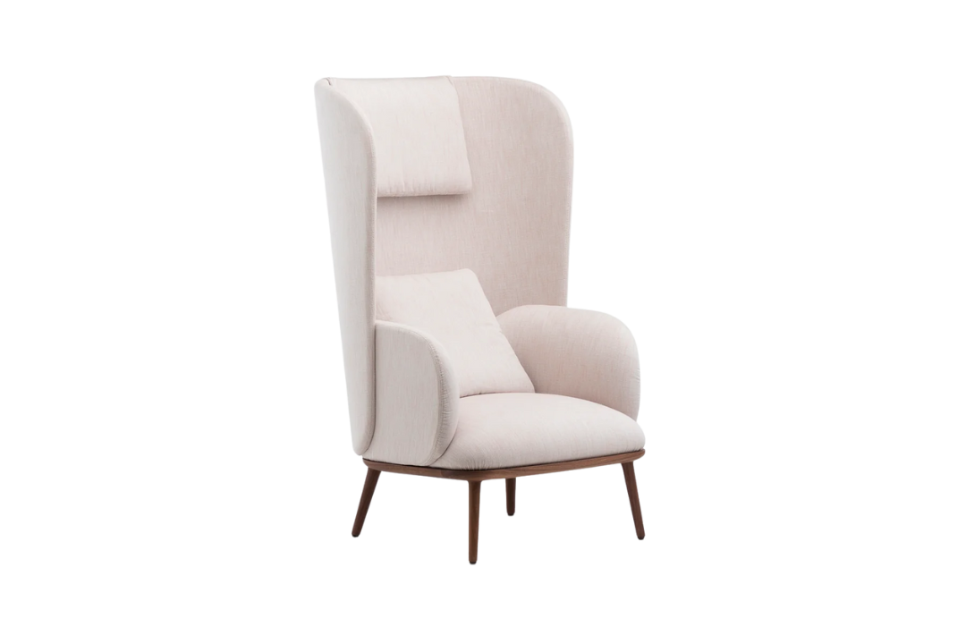 De La Espada is an upright reading chair comprised of layers of upholstered shells, the wraparound form offering a sense of privacy. The taut upholstery on the shells is offset by a luxuriously soft seat and slender solid wood legs.