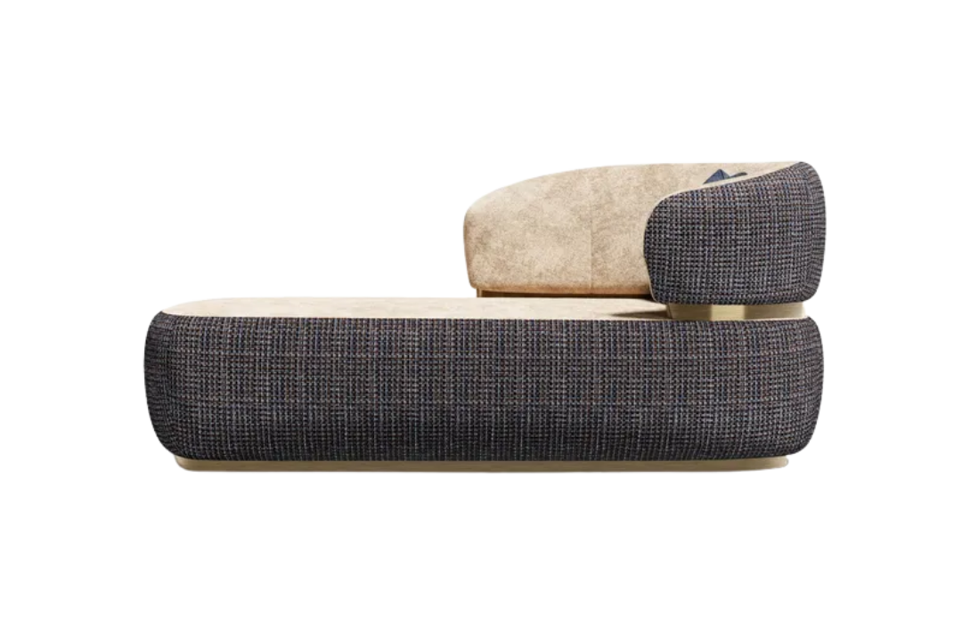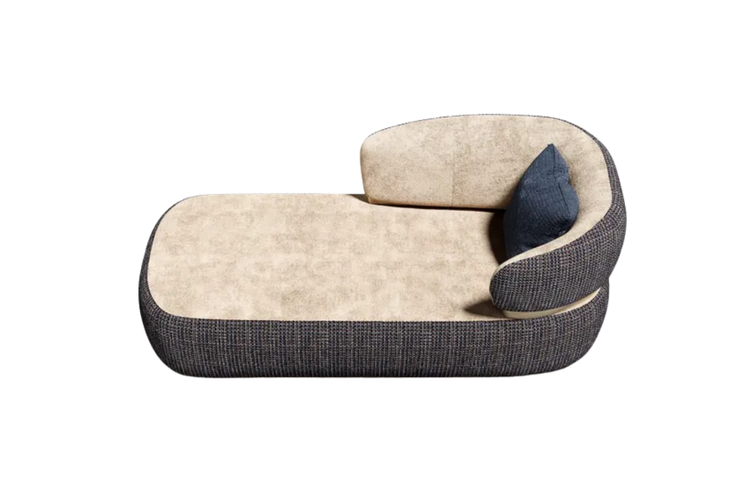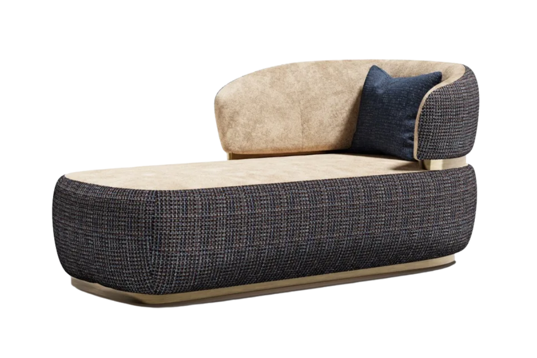 This lounger features a finely contoured shell that embraces the seat, highlighted by a distinctive metal accent on the backrest. The harmonious balance between its rigid frame and soft cushioning creates a smooth, enveloping silhouette. It includes a pre-cover in memory foam for superior comfort and a final cover available in fabric or leather. The base is crafted in metal with elegantly rounded corners, enhancing its modern and refined appeal.