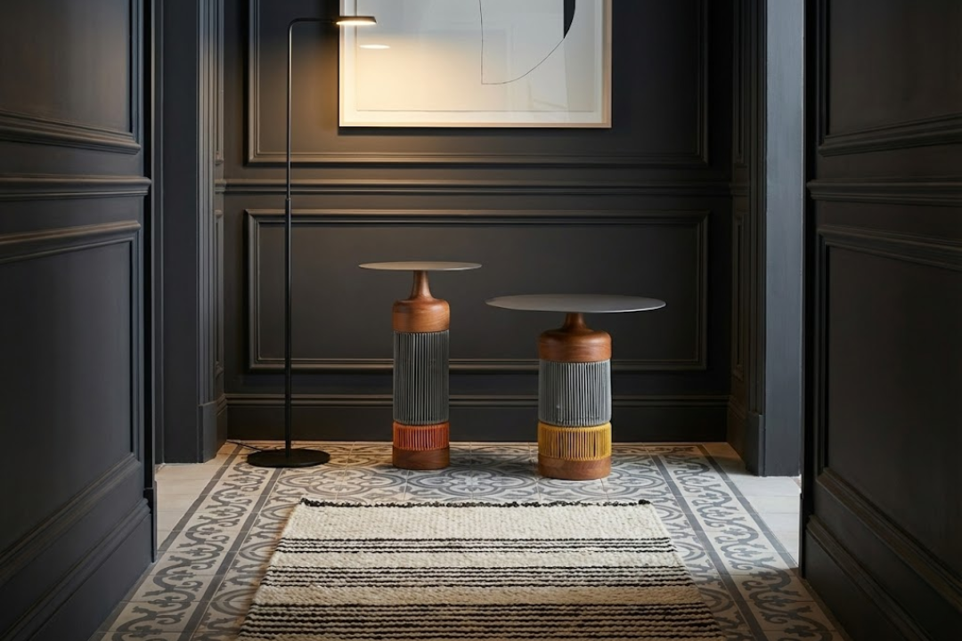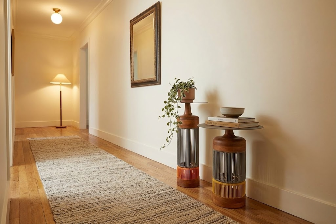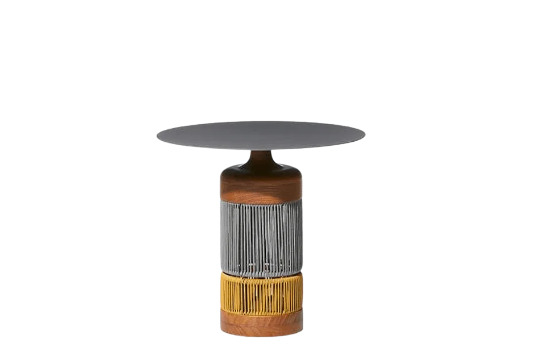 This distinctive bottle side stand is a sculptural accent piece that blends craftsmanship with contemporary design. Inspired by totem-like forms, it features a layered cylindrical base combining warm wood tones with finely spaced vertical detailing, creating depth and texture. The slim, round tabletop appears to float above the base, adding a sense of lightness and balance. Perfect as a side table, drink stand, or decorative pedestal, this piece works beautifully in modern living spaces, lounges, or beside seating, offering both visual intrigue and functional elegance.