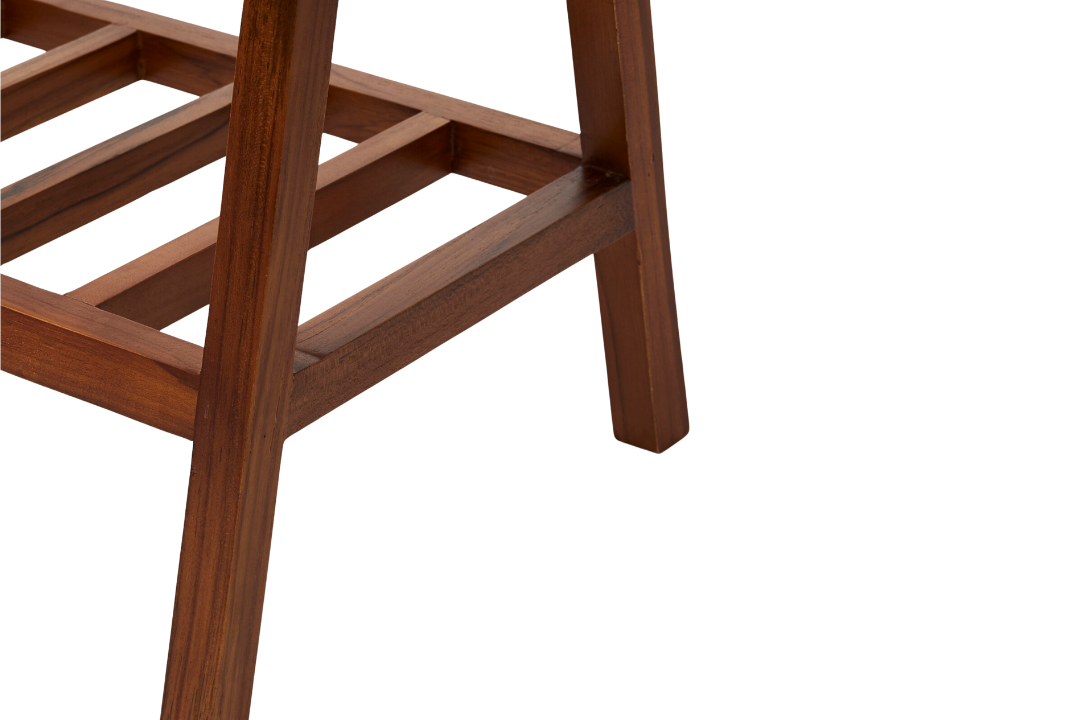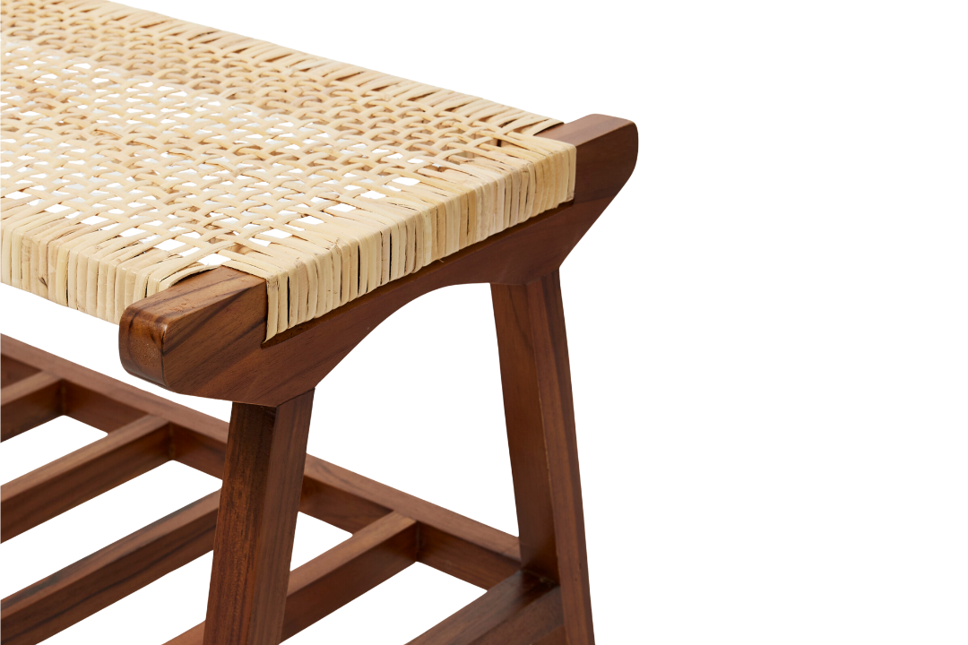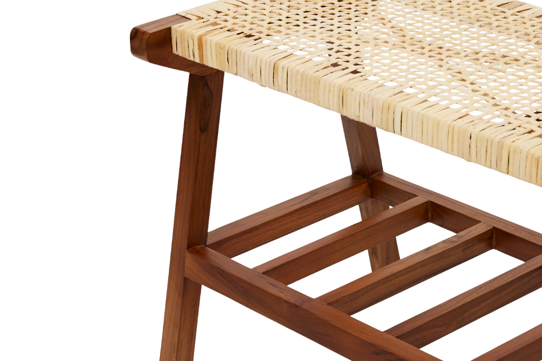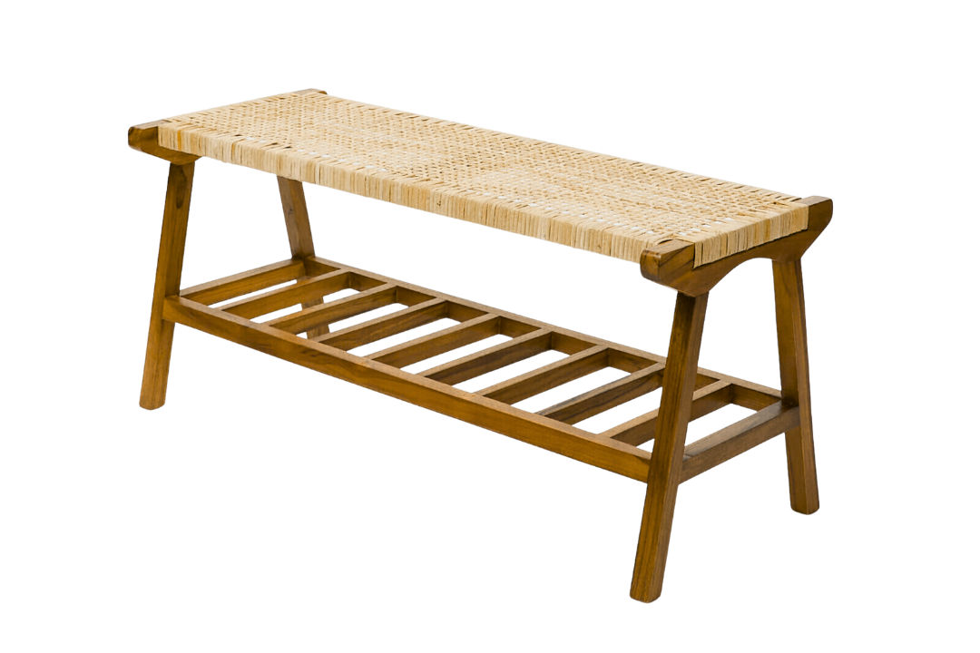 This elegant rectangular bench combines a cool cream rattan base with a sleek dark brown teak frame, offering both style and practicality. Perfect for hallways or bedrooms, it serves as a statement seating piece while doubling as a convenient shoe rack to keep your space organized. Featuring a textured finish and crafted from durable wood, it comfortably seats two and brings a warm, natural touch to any interior setting. Designed for indoor use only.