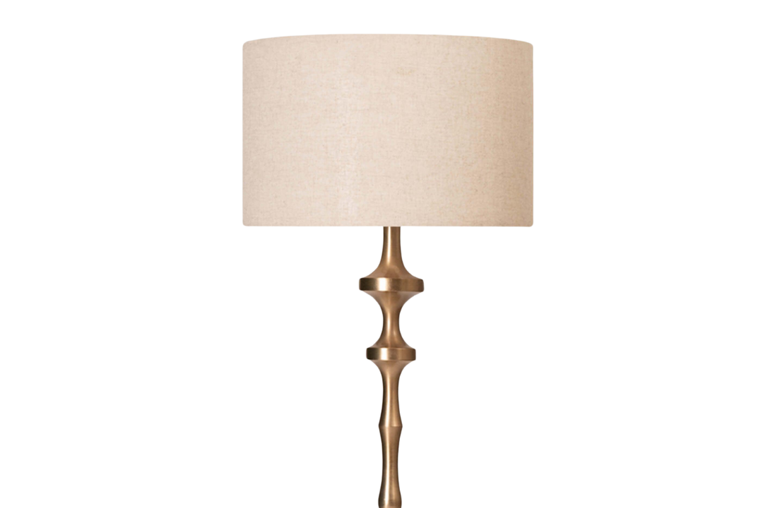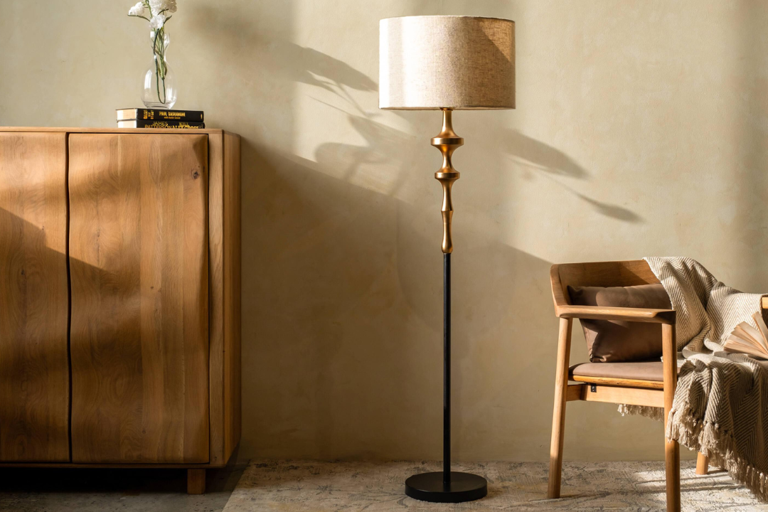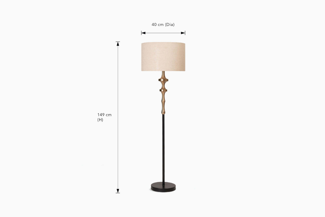 The David Black Steel Floor Lamp is a stunning gold plated lamp for bedroom, featuring a traditional candlestick-shaped base with a sleek black finish, topped with a natural linen shade. This tall floor lamp adds an elegant touch to any living room or bedroom, combining classic design with modern appeal. This decorative floor lamp is the perfect piece to enhance any room's decor.
