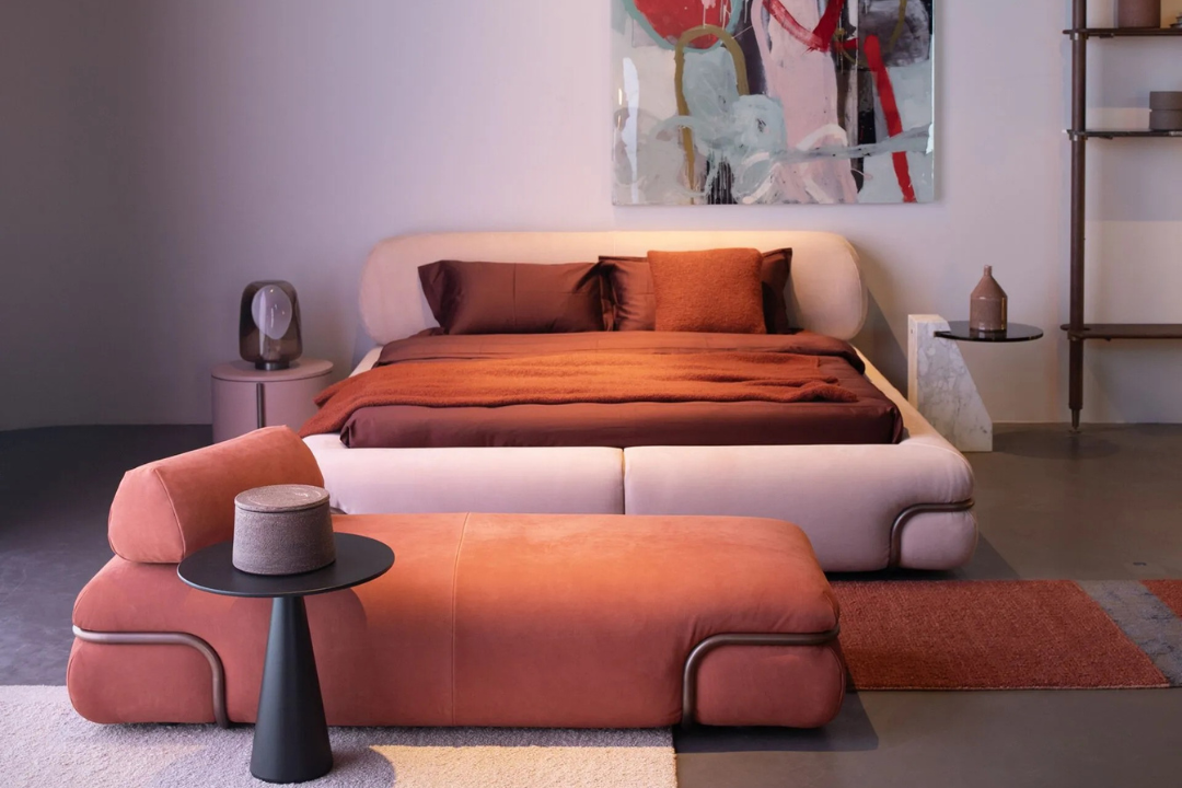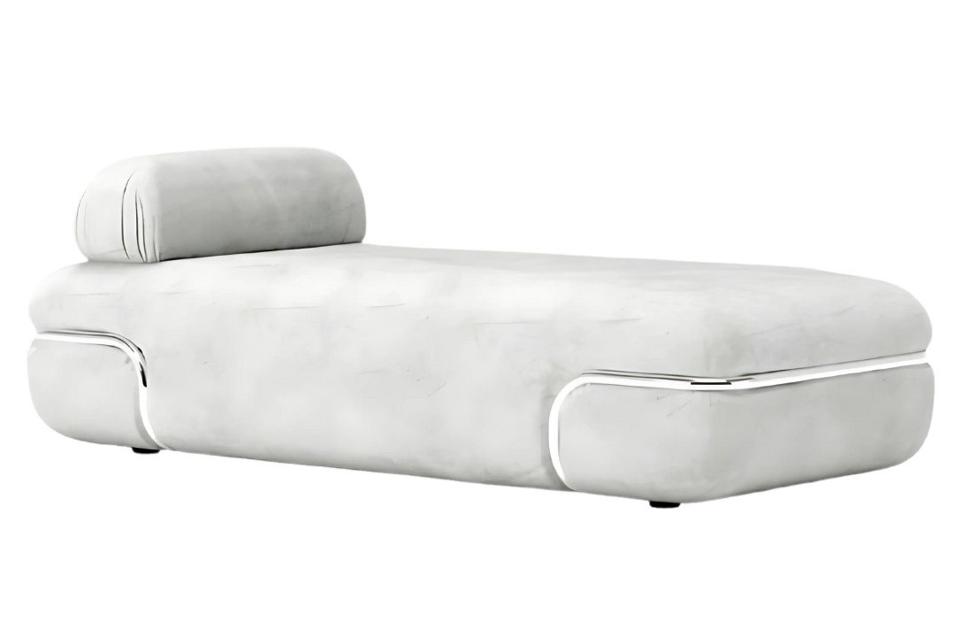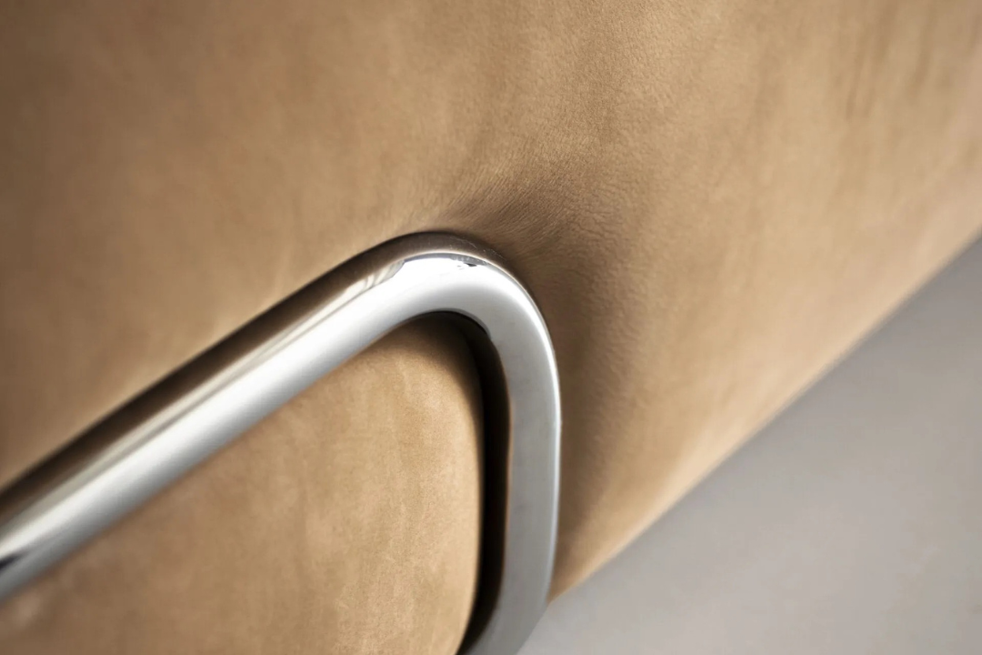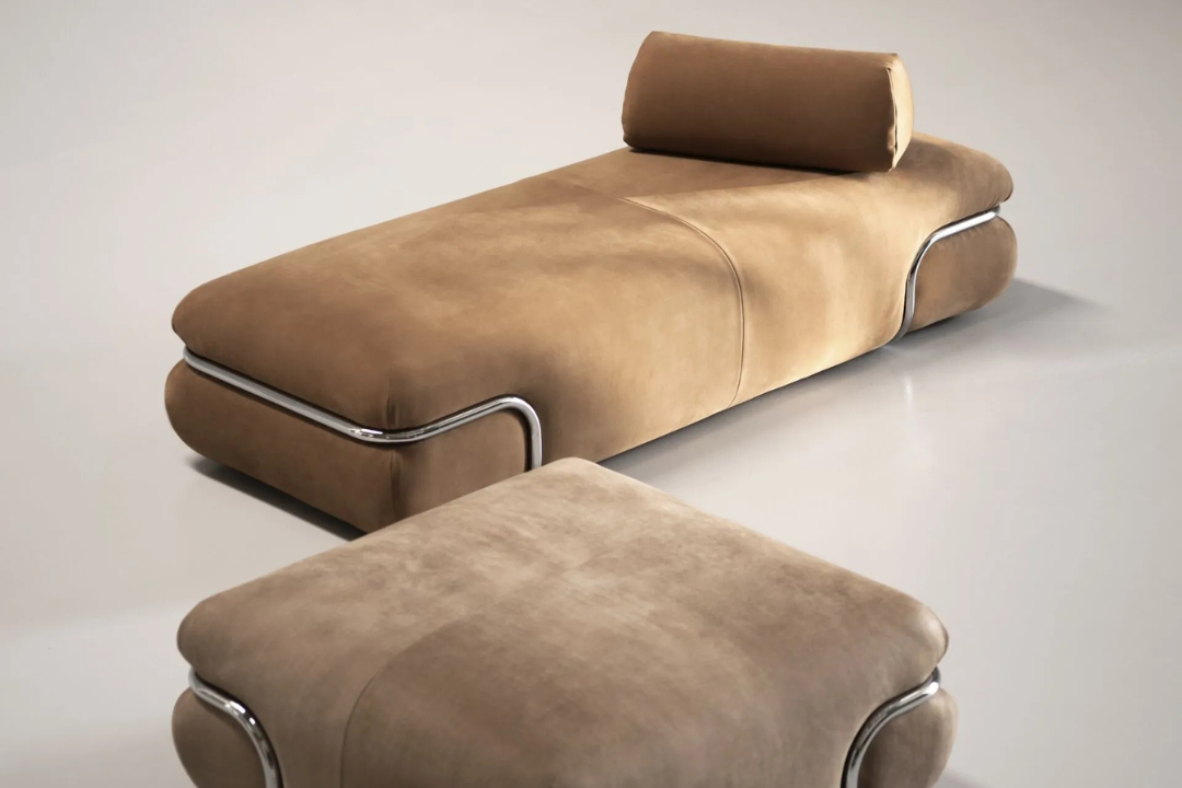 The So Soft Dormeuse longue can be configured with the soft leather upholstery's wide range of colors and finishes. Two types of finishes for the decorative metal tubes of the structure are available, choosing between brushed hand-burnished metal or glossy chrome-plated metal. The So Soft seat can be further personalized with the addition of back cushions from the same line.