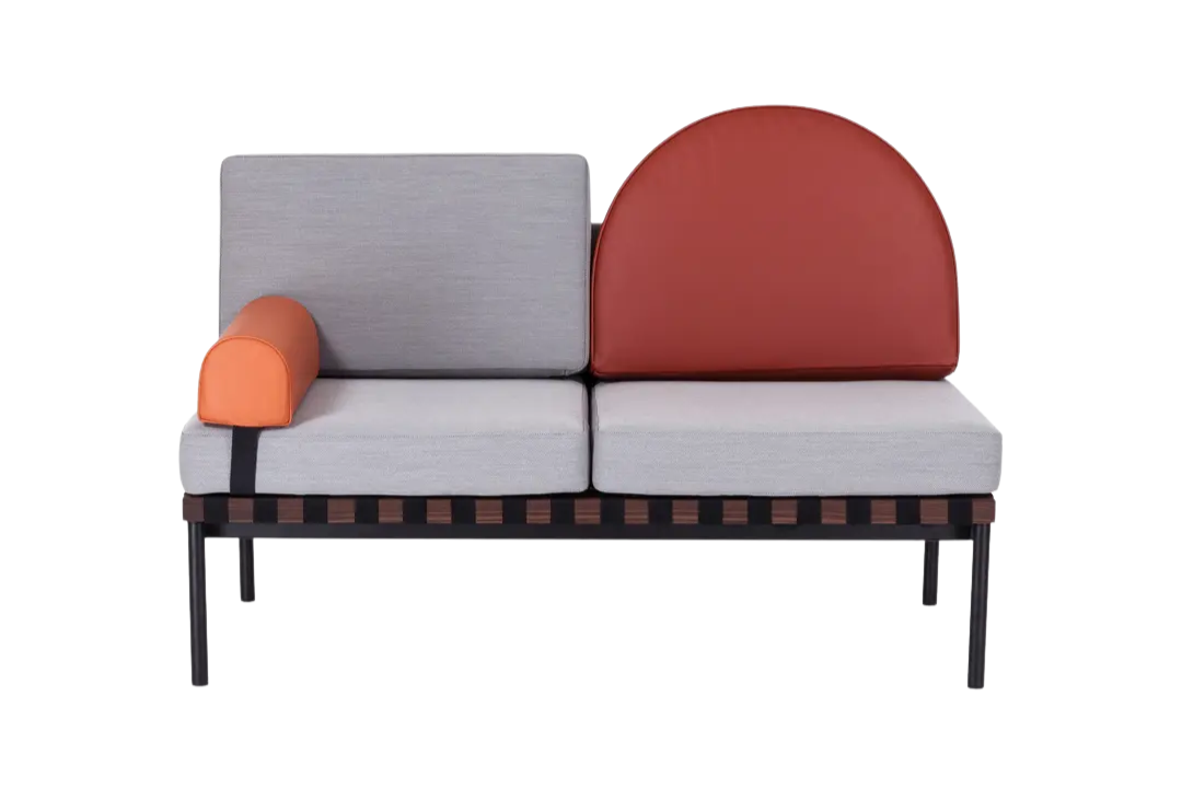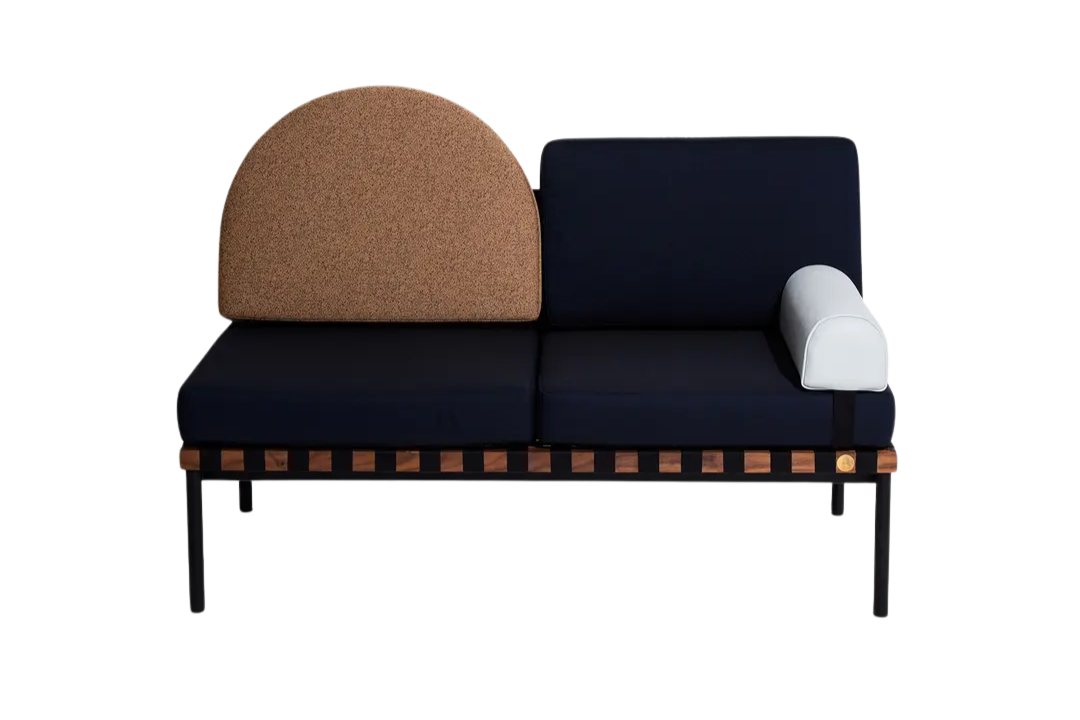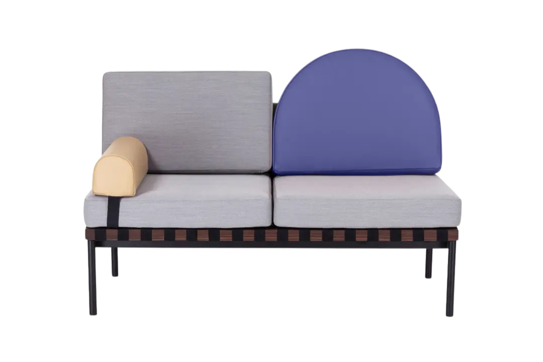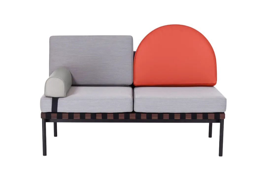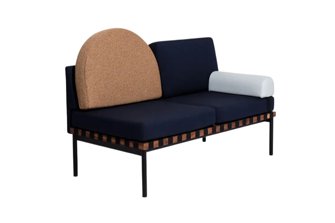 The Grid Sofa by Petite Friture draws inspiration from Bauhaus design principles, combining clean geometry with functional elegance. It features a solid wooden structure and a tubular black steel base, complemented by modular leather and fabric cushions with removable covers for easy maintenance. A walnut shelf adds both warmth and practicality to the design. The sofa is clean, firm, and free from stains, offering both comfort and timeless modern style.