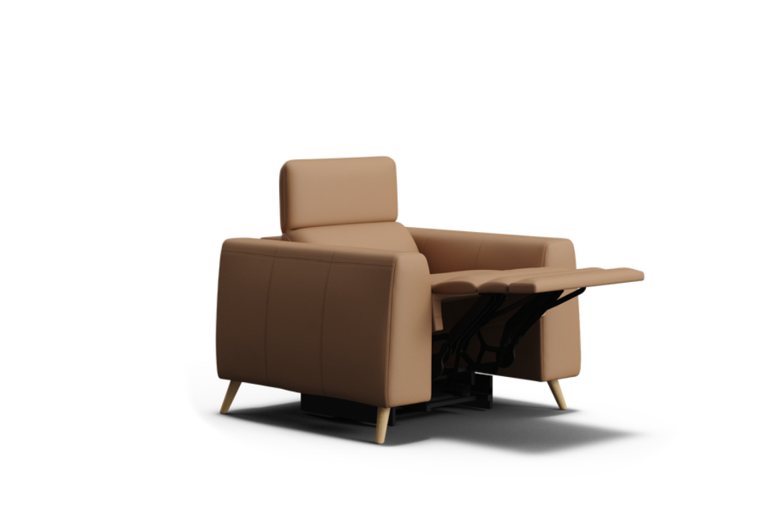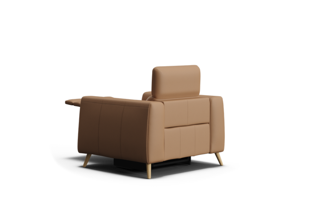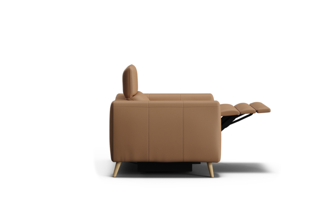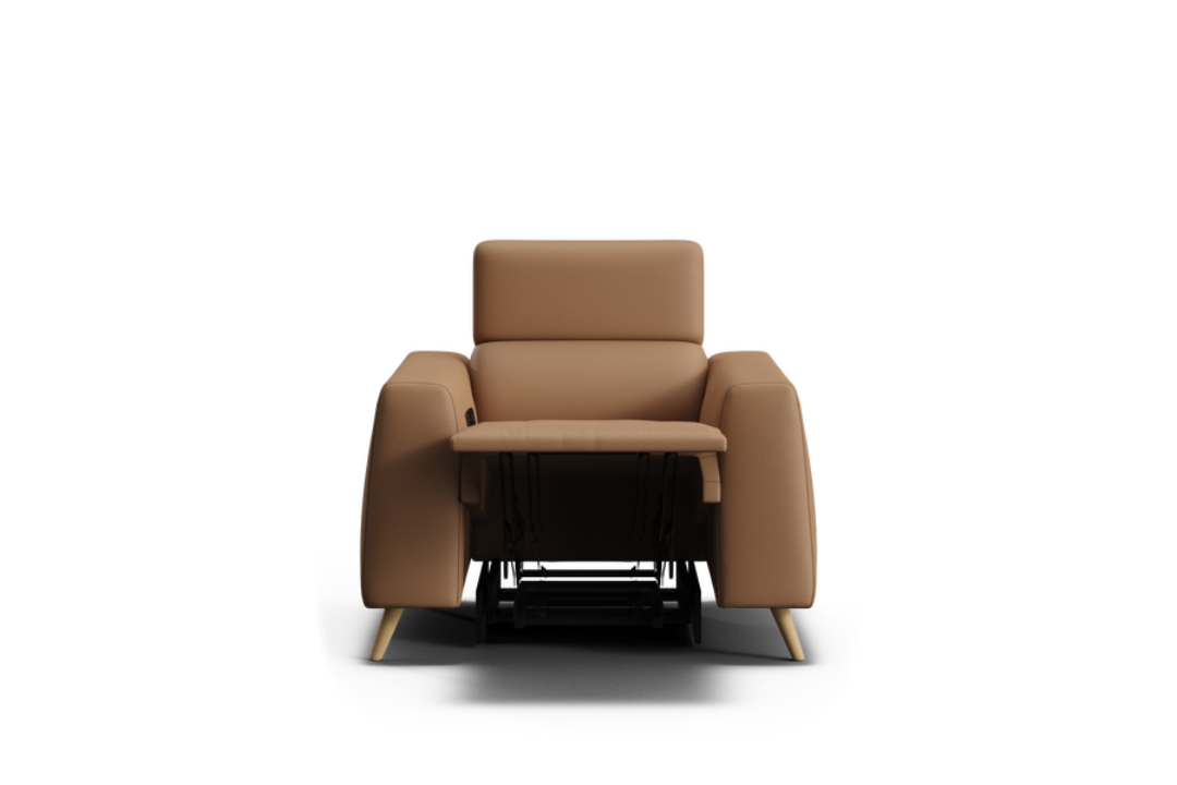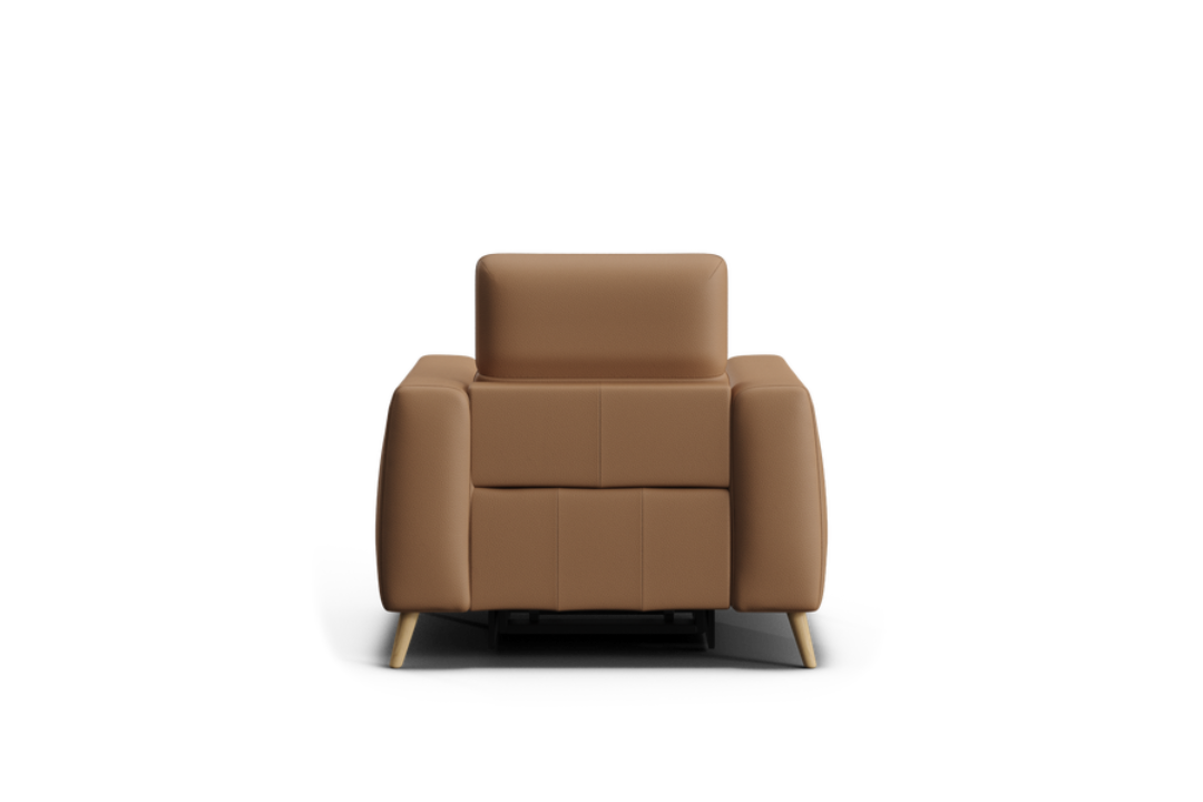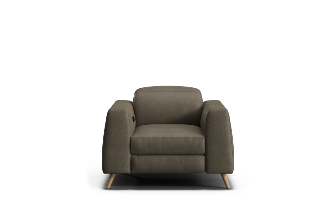 The Huntah Powered Recliner offers a modern interpretation of the classic recliner, combining timeless style with advanced comfort. Its clean, box-like silhouette is complemented by wide tapered arms and ultra-soft cushions, all upholstered in 100% premium leather. Featuring zero-gravity reclining and adjustable headrests, Huntah delivers superior relaxation and ergonomic support. Concealed side controls operate the recliners and include Type-C and USB charging ports for added convenience. The optional add-on console enhances functionality with a wireless charging pad, storage compartment, and retractable drink holders. Completed with elegant grey-wash timber legs, Huntah perfectly balances sophistication, comfort, and modern innovation.