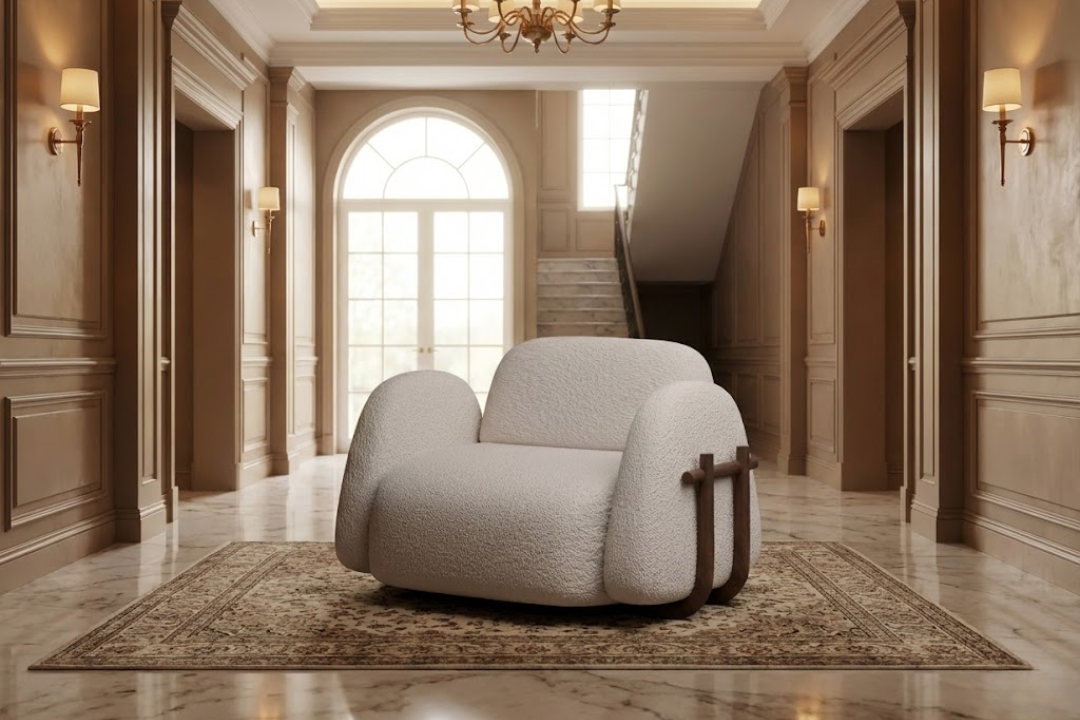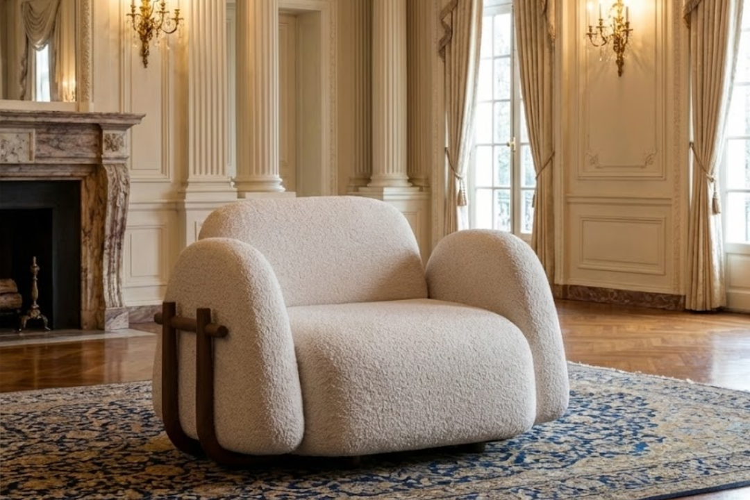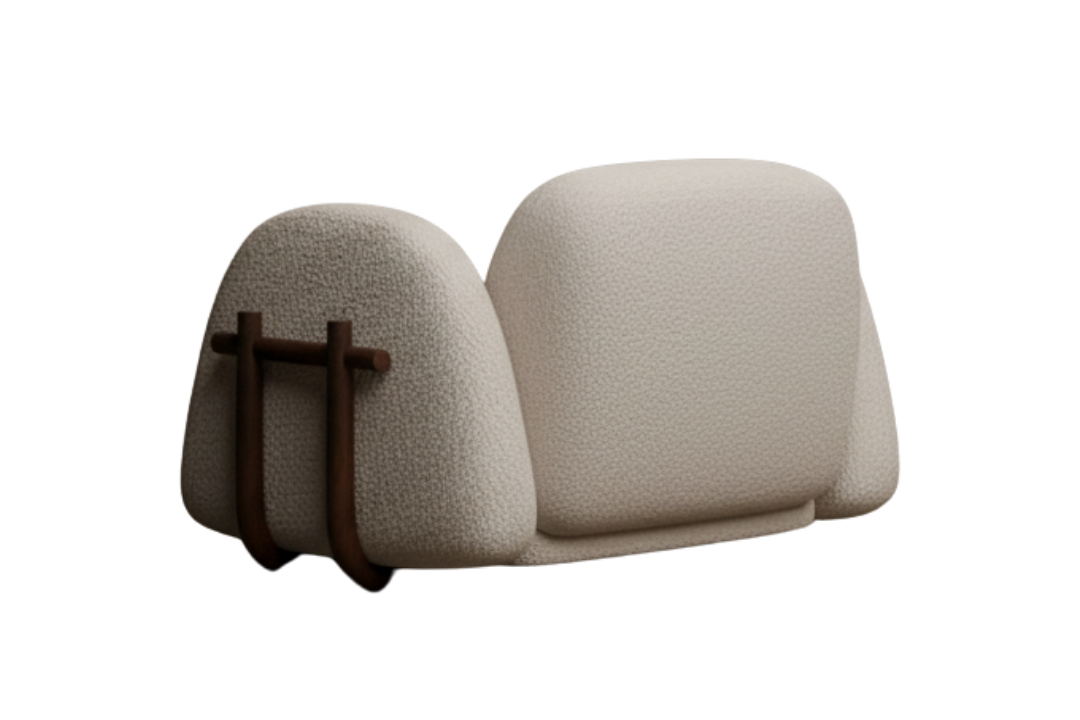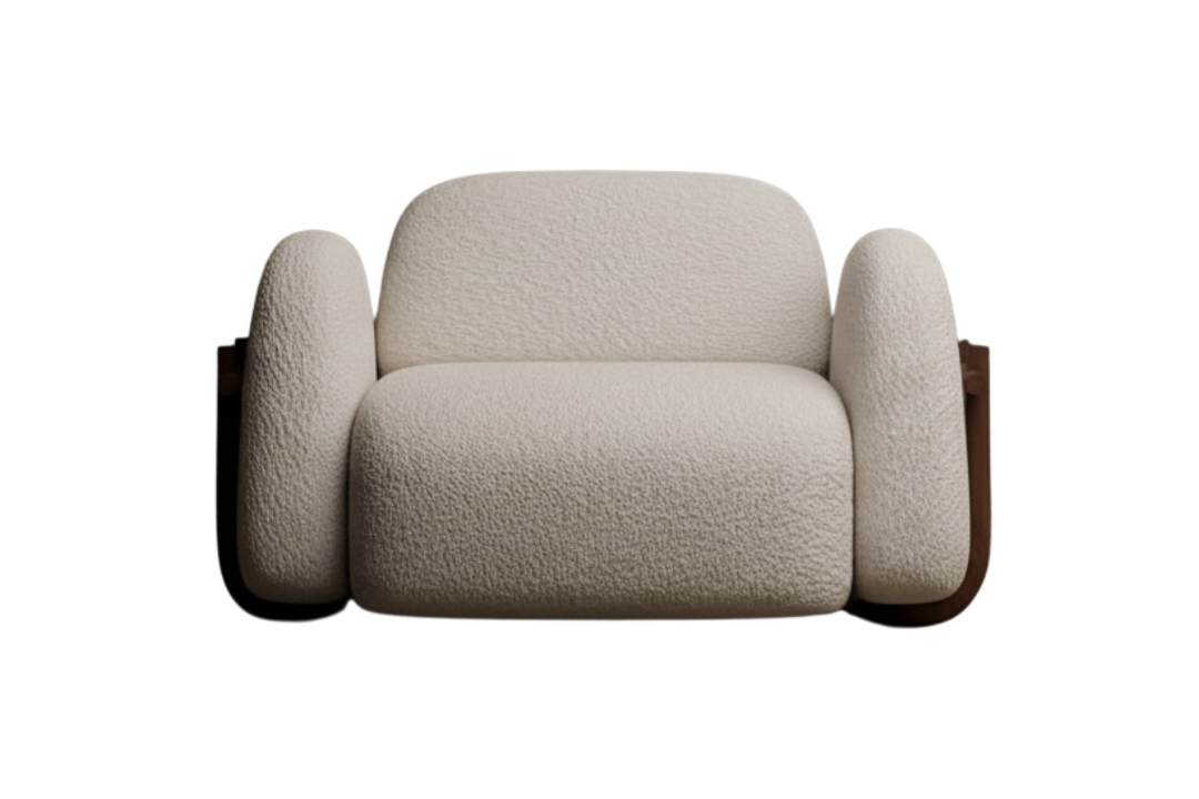 This sculptural Kome chair blends soft, enveloping comfort with refined modern character. Fully upholstered in a textured, plush fabric, its generously rounded seat, backrest, and armrests create a cozy, cocoon-like presence that invites deep relaxation. The flowing, seamless form is elegantly contrasted by subtle solid wood detailing on the side, adding warmth and a touch of craftsmanship. With its bold yet comforting silhouette, this chair functions as both a statement piece and a sanctuary—perfect for contemporary living rooms, lounges, or reading corners.