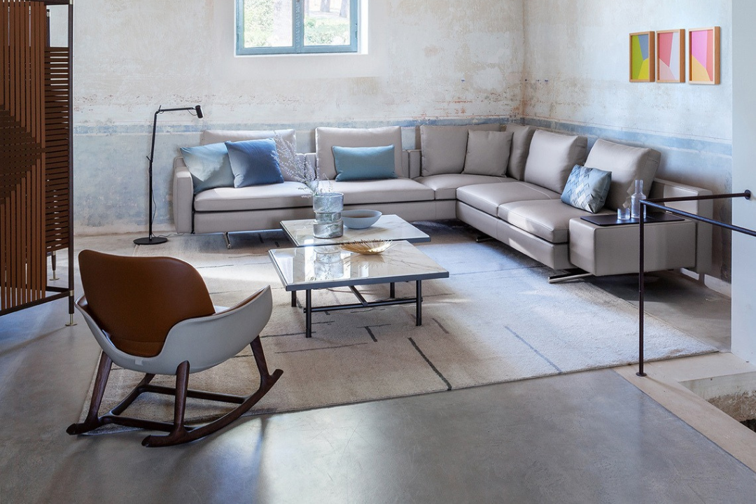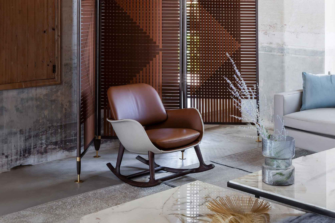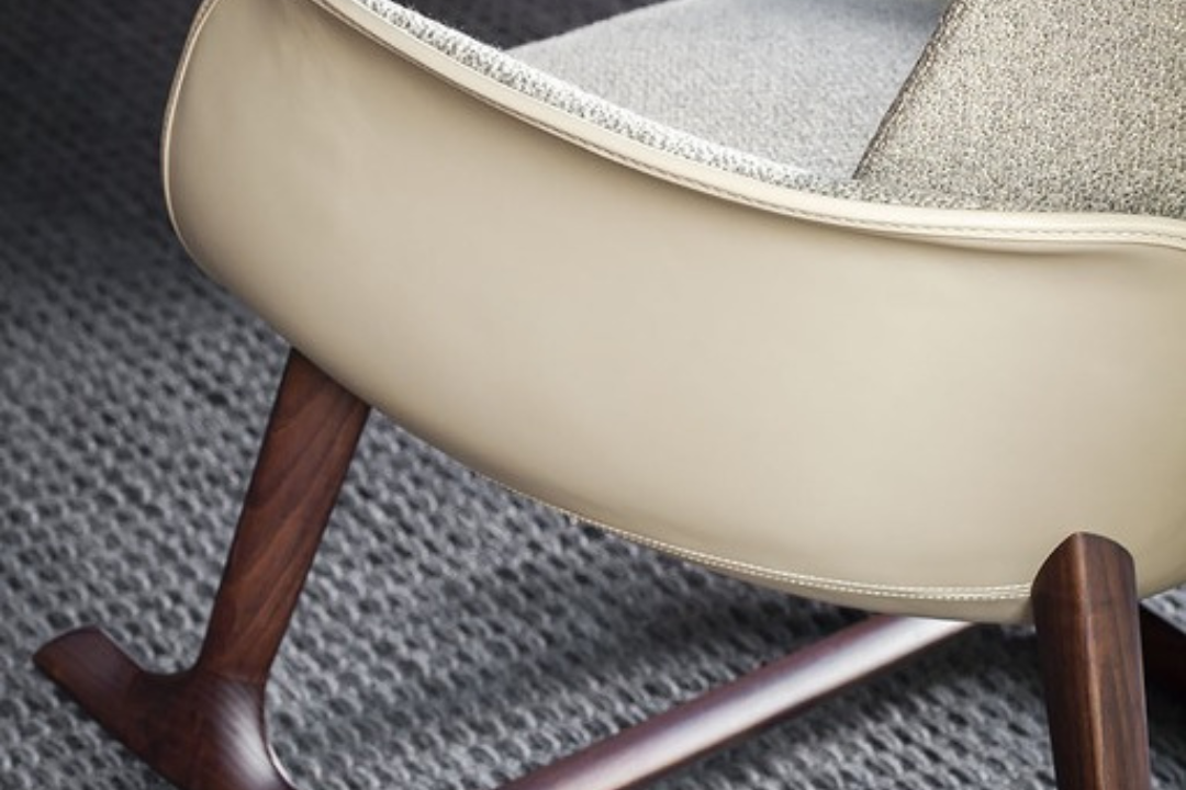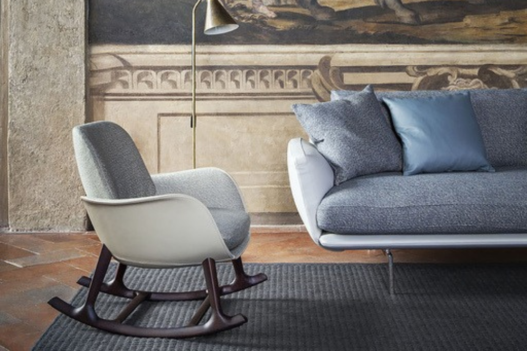The design of the Martha rocking chair arises from the meeting of the two principal elements of the shell, both made of rigid polyurethane obtained by molding. The seat and armrests form part of a single, sinuous, open line, with both ends inclined outward. The curved and slightly padded backrest appears to float in the air; in reality it is attached to the shell by a concealed system. A triangular‑section wood trestle supports the whole. A slight tilt of the seat toward the back promotes optimal comfort and accentuates the dynamic design of the chair. The rocking base is made of solid ash wood. The play of colors and material contrasts helps emphasize Martha’s fluid and light line.
