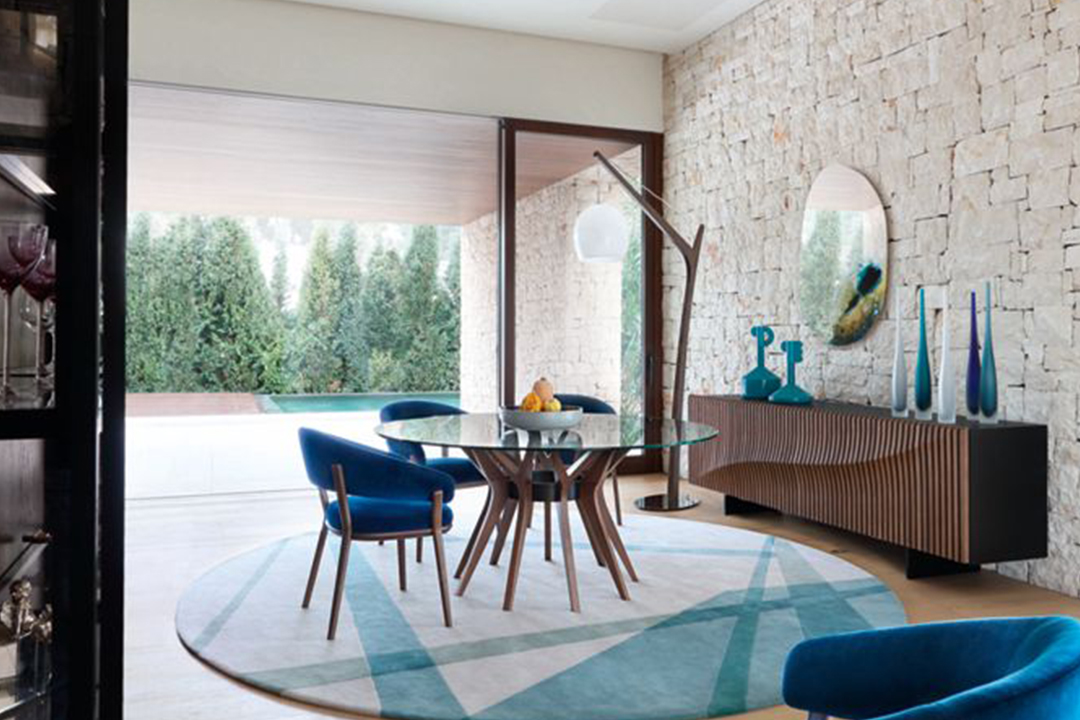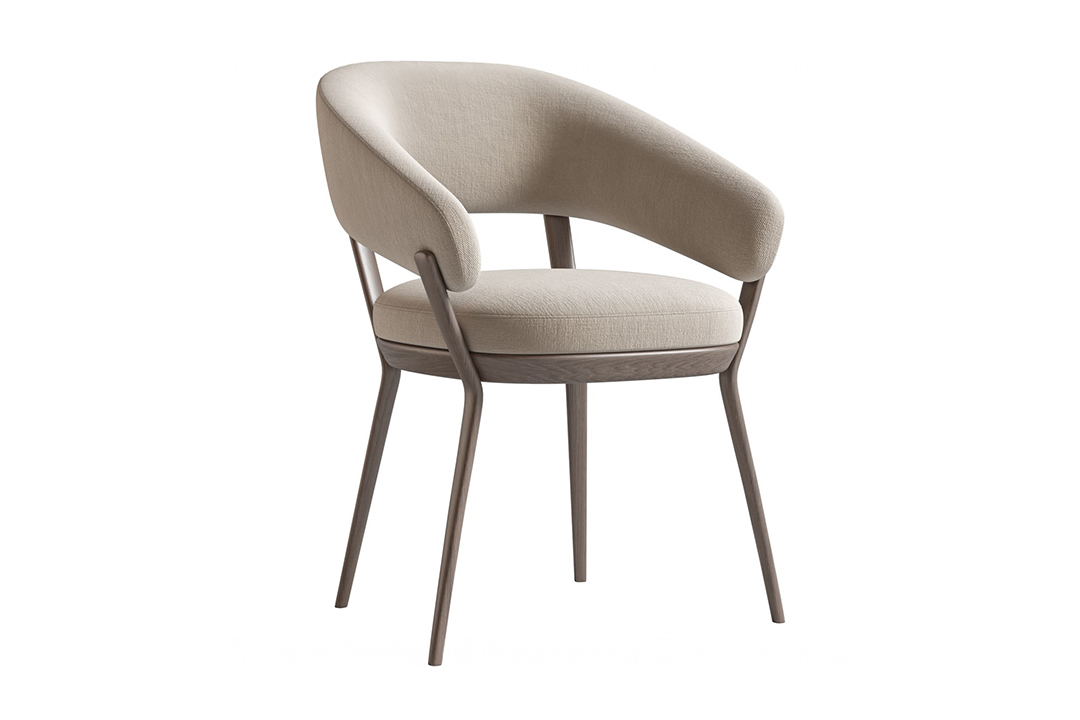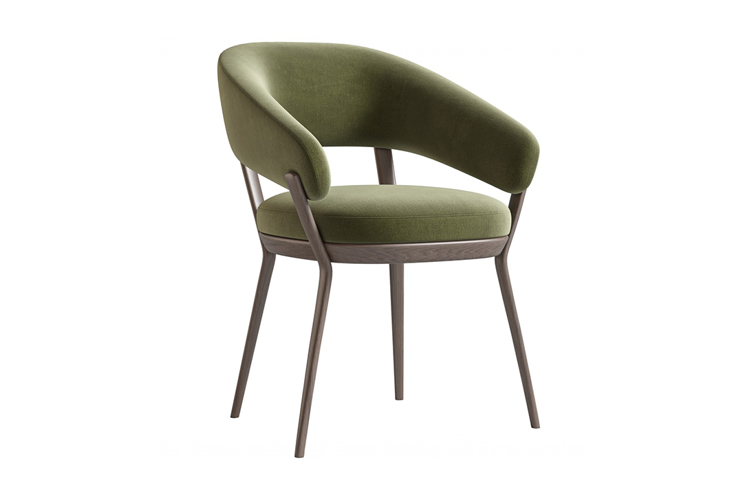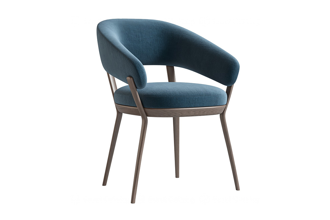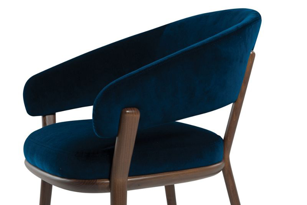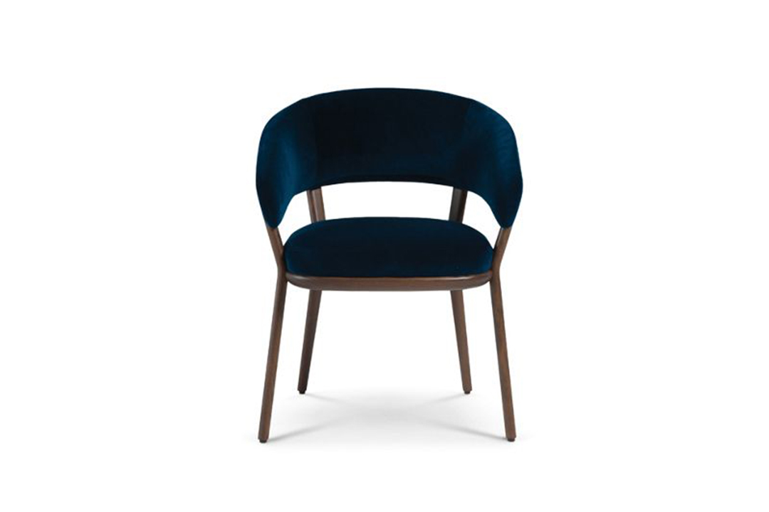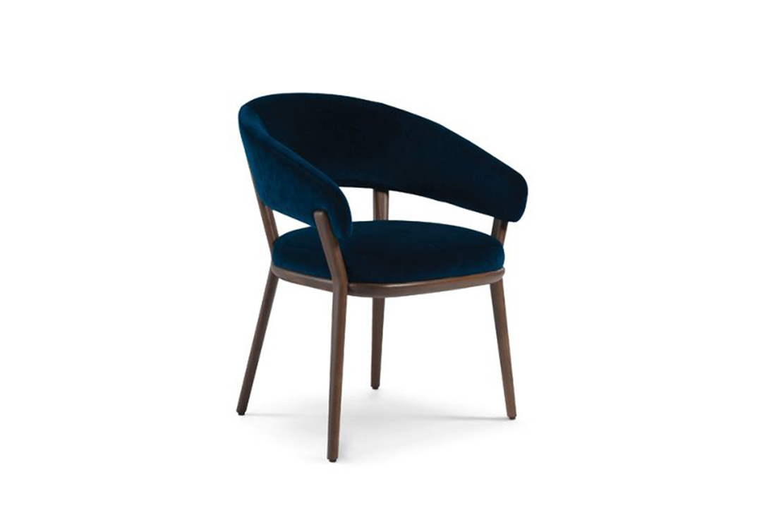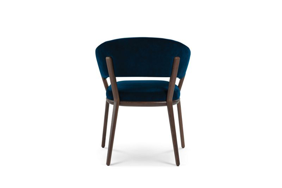 This chair epitomizes modern elegance with its sleek walnut frame and wraparound backrest that seamlessly integrates with the armrests. The deep navy velvet upholstery adds a luxurious touch, making it a standout piece for contemporary dining rooms, offices, or living spaces.