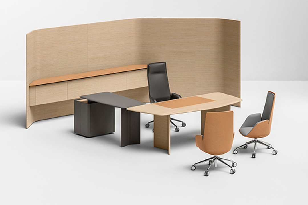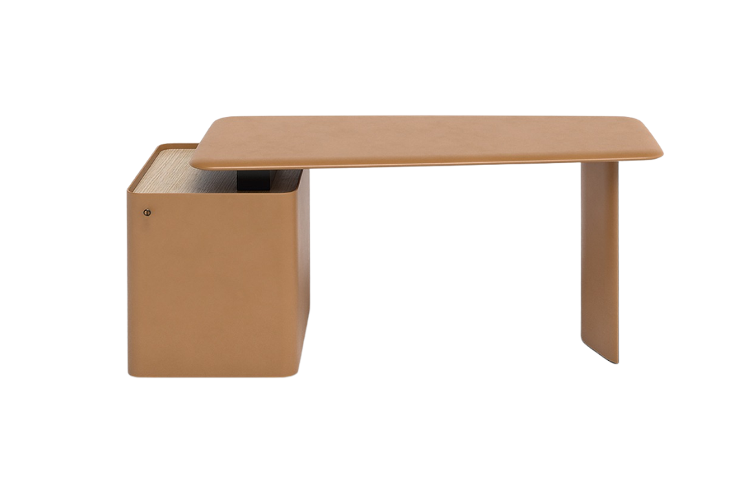 The Trust Small desk collection reimagines the traditional workspace with soft, flowing lines that promote openness and comfort. Available in two versions—Trust Iconic, with a wavy profile for collaborative use, and Trust Regular, with a refined rectangular form—each comes in multiple sizes, including asymmetric options combining a leg and storage cabinet. Finishes include Techno Wood and full or partial leather upholstery, with seamless craftsmanship that blends technology and artistry. Designed for versatility, Trust desks can be equipped with custom cable management, modesty panels, and integrated leather or wood workpads, making them ideal for both executive and home environments.
