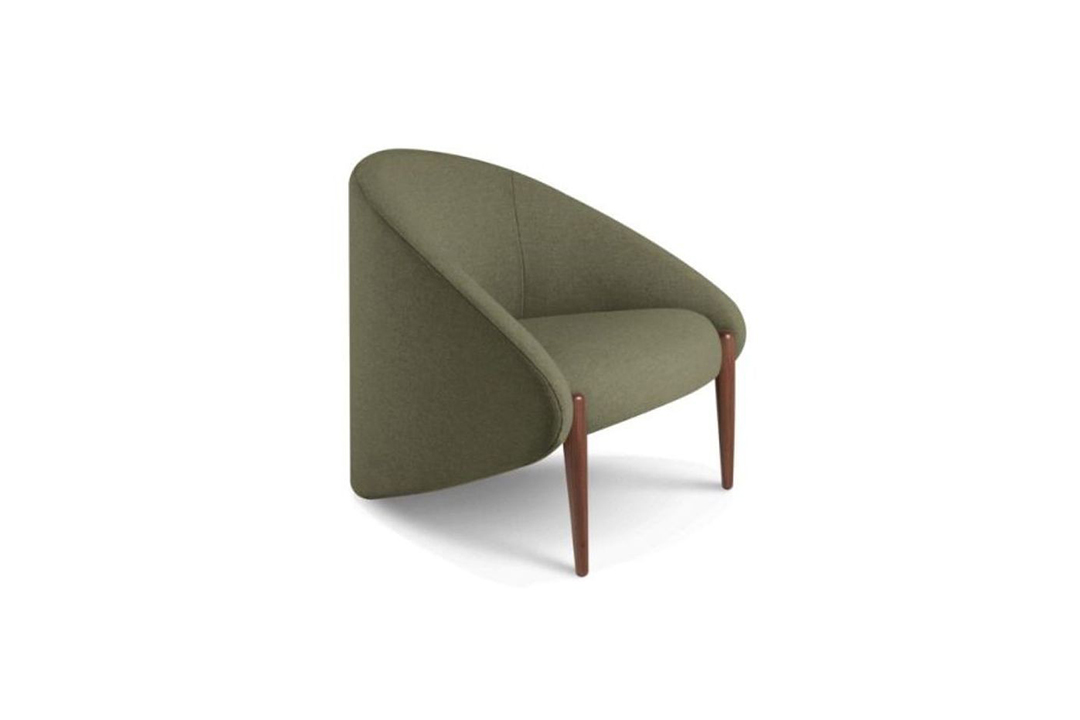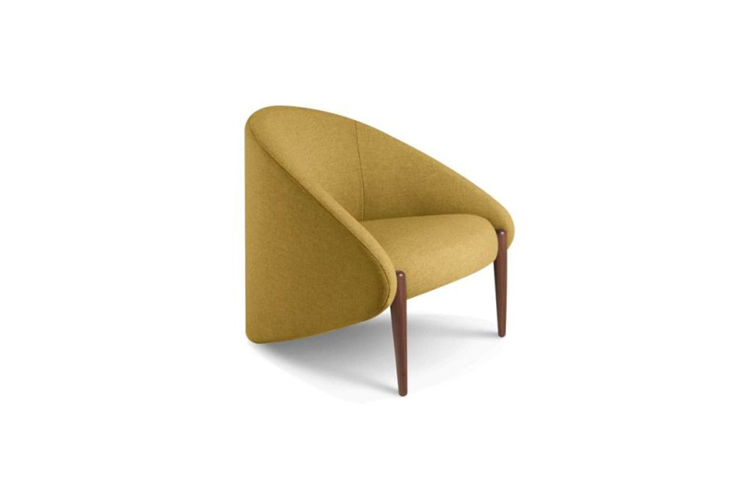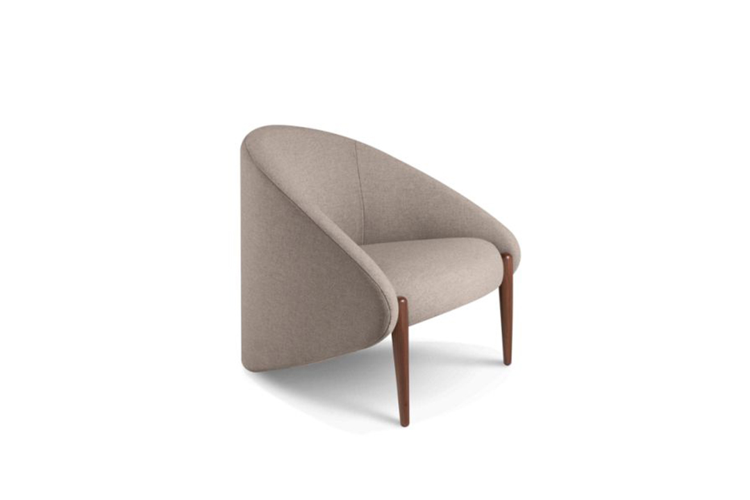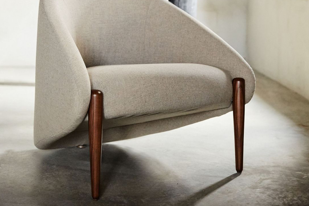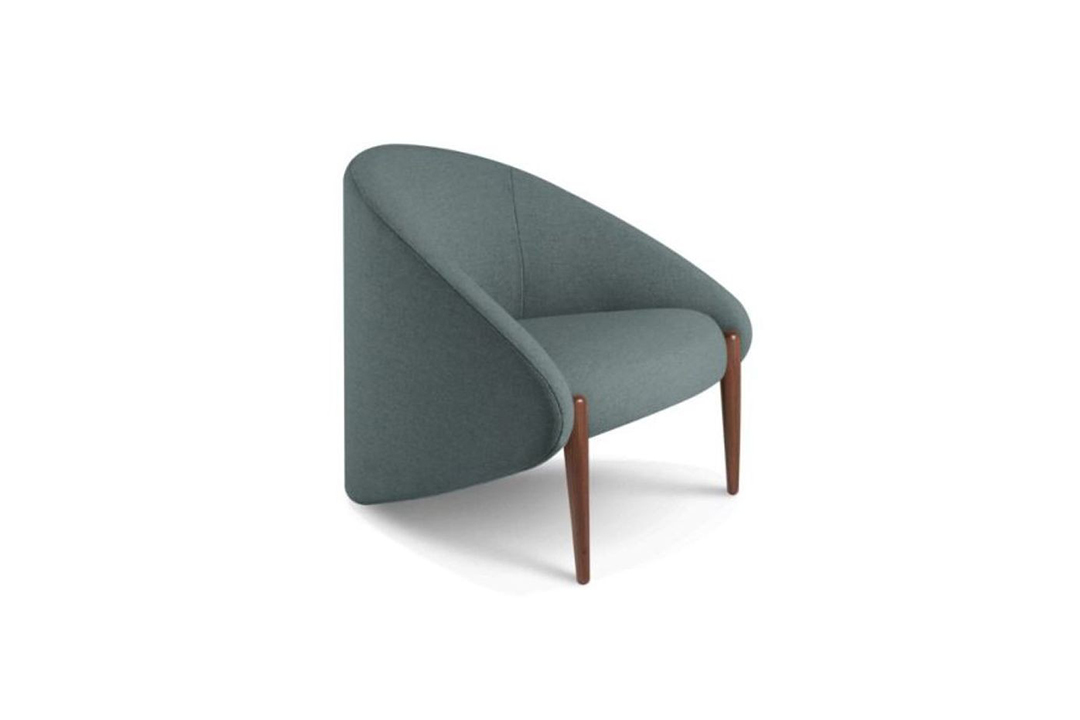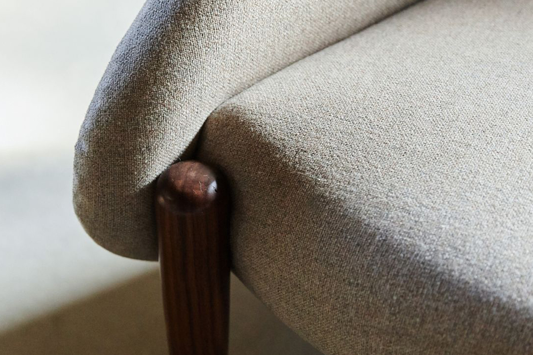 This armchair showcases mid-century modern charm with its light wood frame and clean, angular lines. The wide, angled backrest and integrated armrests create a welcoming silhouette, while the light gray upholstery adds a contemporary touch, making it ideal for stylish living rooms or offices.